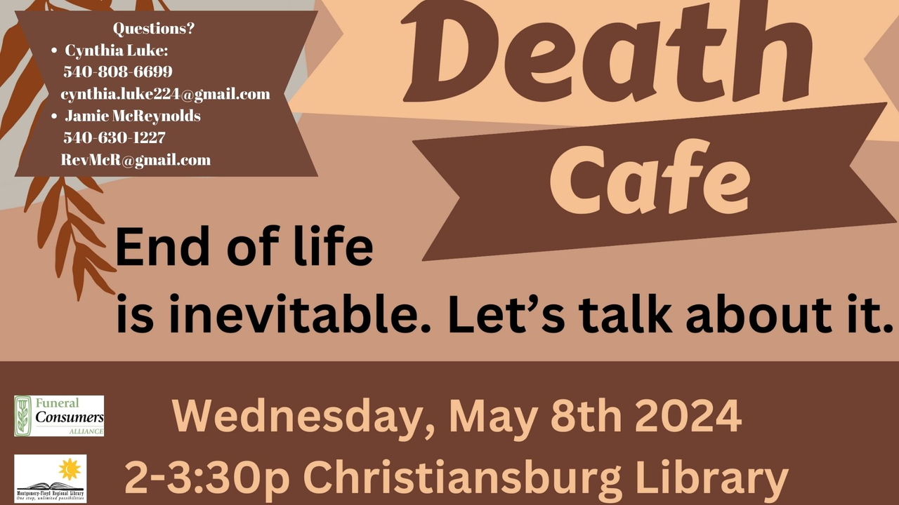 The Christiansburg Library presents Death Cafe with the Funeral Consumer Alliance of the Virginia Blue Ridge on Wednesday, May 8, 2024.