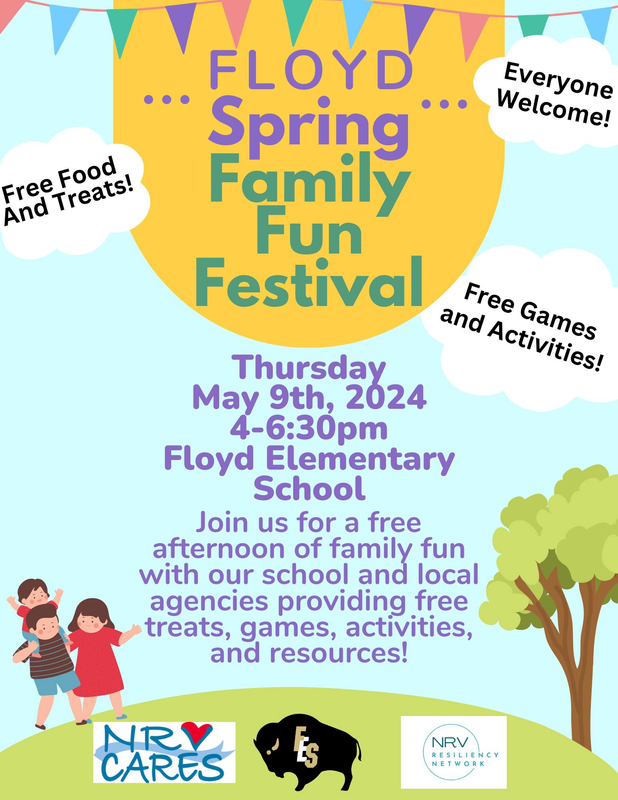 NRV Cares, NRV Resiliency Network and Floyd Elementary School presents the 2024 Floyd Spring Family Fun Festival on Thursday, May 9, 2024 at Floyd Elementary School.