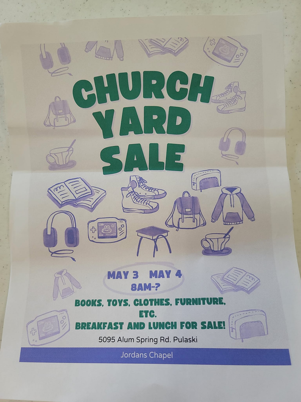 Jordan's Chapel Church presents a Church Yard Sale Fundraiser for Feed My Lambs Backpack Program on Friday, May 3, 2024 and Saturday, May 4, 2024 starting at 8:00 AM on both days.