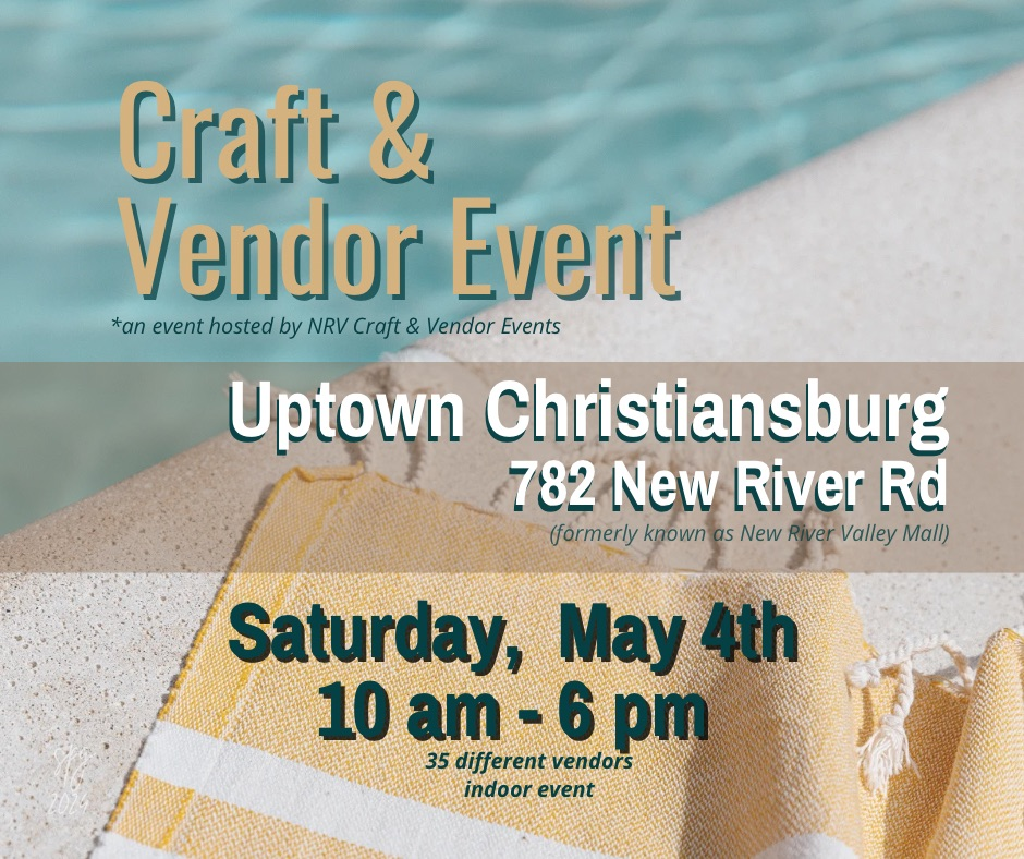 NRV Craft & Vendor Events hosts their 2024 May Craft & Vendor Fair on Saturday, May 4, 2024 at Uptown Christiansburg (formerly New River Valley Mall).