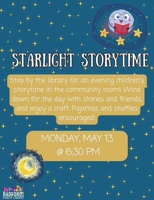 The Radford Public Library presents a Starlight Storytime on Monday, May 13, 2024.