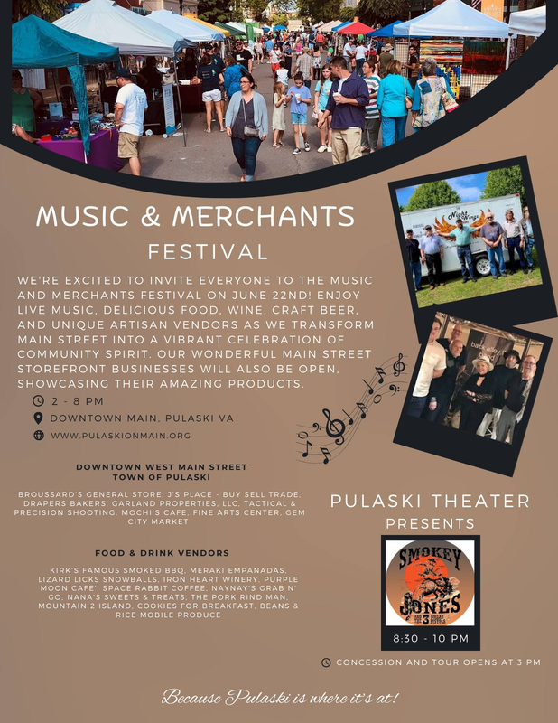 Pulaski on Main presents Music and Merchants 2024 on Saturday, June 22, 2024 on West Main Street in downtown Pulaski, VA.