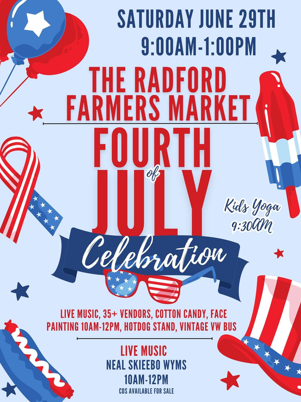 2024 Radford Farmers Market Fourth of July Celebration with Live Music, Cotton Candy, Hot Dogs