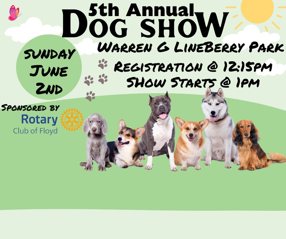 The Rotary Club of Floyd County presents their 5th Annual Rotary Dog Show on Sunday, June 2, 2024 at the Warren G. Lineberry Memorial Park in Floyd, VA.