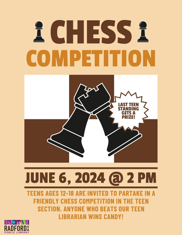 The Radford Public Library presents Teen Friendly Chess Competition on Thursday, June 6, 2024.