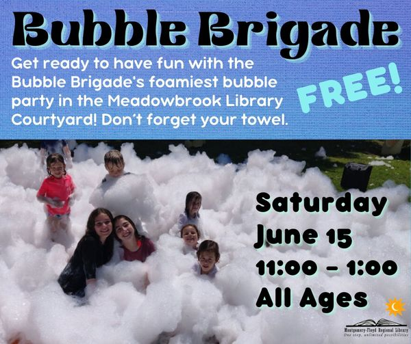 Get ready to have fun with the Bubble Brigade's foamiest bubble party in the Meadowbrook Library Courtyard! Don’t forget your towel. There will be cool refreshments and some door prizes, too.