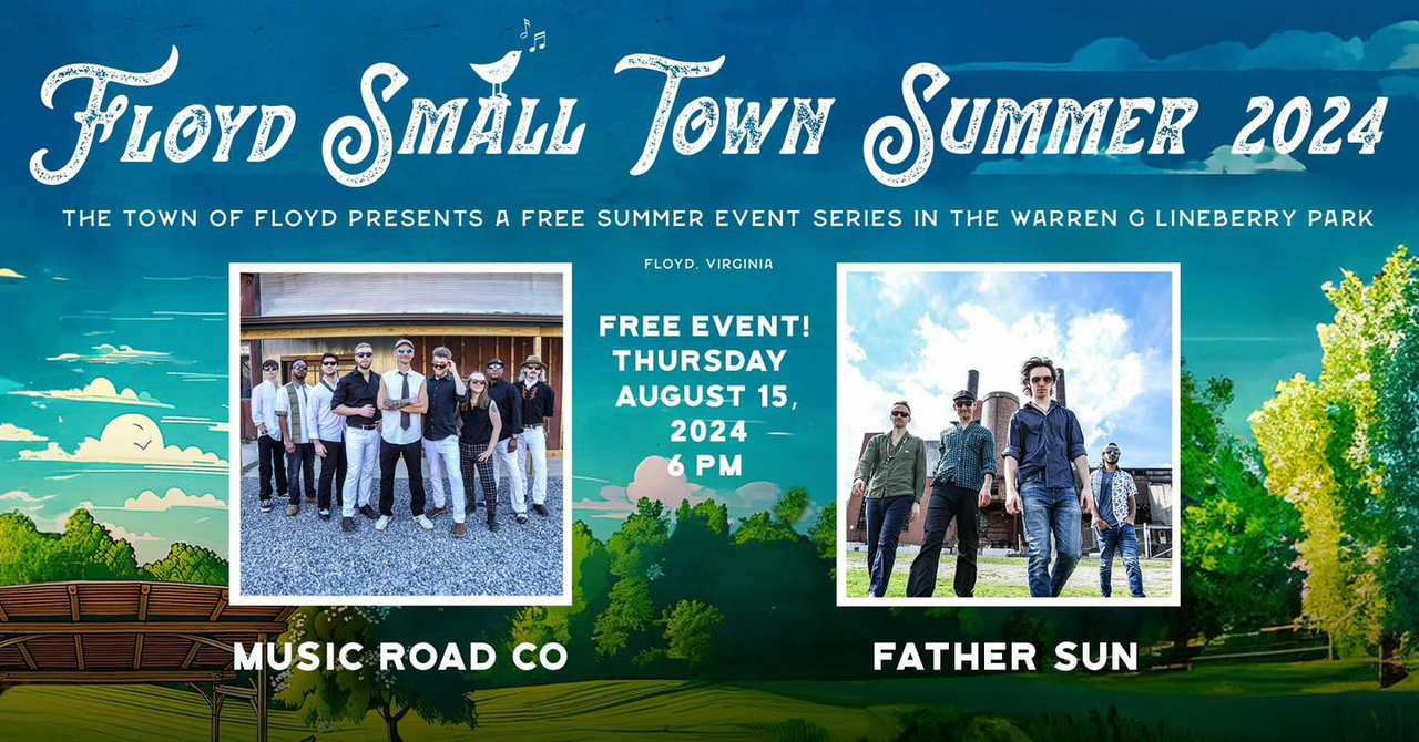 The Town of Floyd continues their 7th Annual Floyd Small Town Summer event series with Music Road Co. and Father Sun on Thursday, August 15, 2024 outside at Warren G. Lineberry Memorial Park.