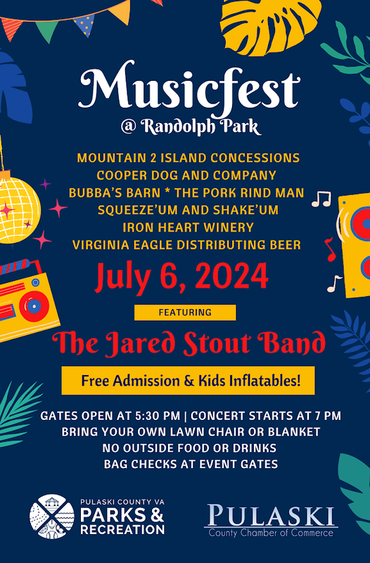 The Pulaski County Parks & Recreation and the Pulaski County Chamber of Commerce continues the Musicfest 2024 Concert Series with The Jared Stout Band on Saturday, July 6, 2024 at Randolph Park in Pulaski, VA.