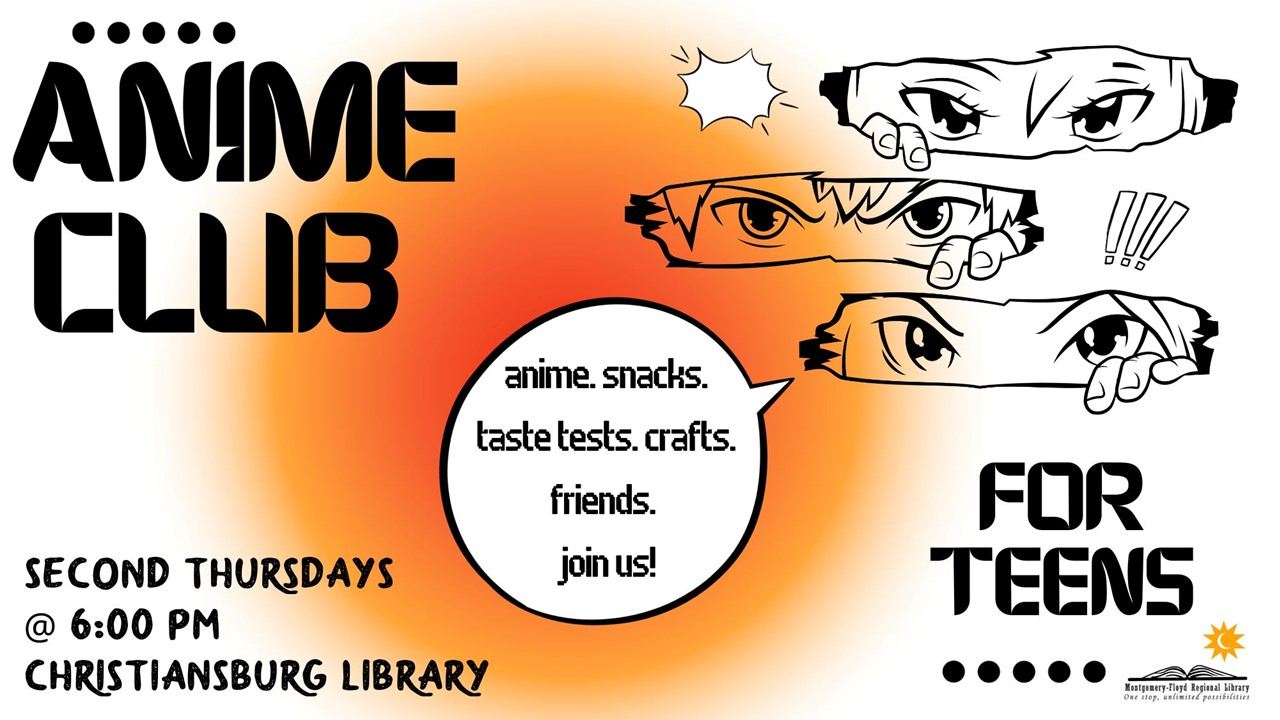 The Christiansburg Library presents Anime Club for Teens on Thursday, June 13, 2024.