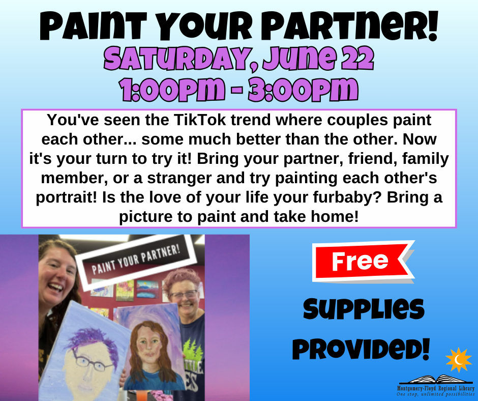 You've seen the TikTok trend where couples paint each other. Now it's your turn to try it! Bring your partner, friend, family member, or a stranger and try painting each other's portrait! Is the love of your life or your furbaby?