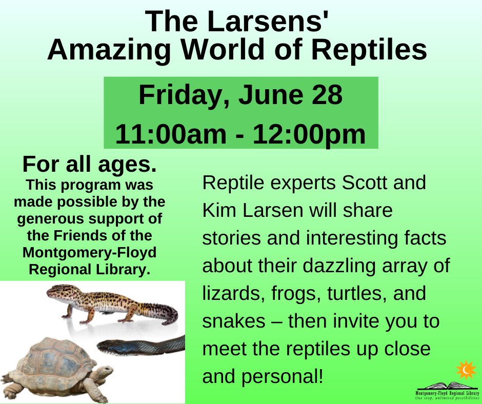 Reptile experts Scott and Kim Larsen will share stories and interesting facts about their dazzling array of lizards, frogs, turtles, and snakes. Then they will invite you to meet the reptiles up close and personal!