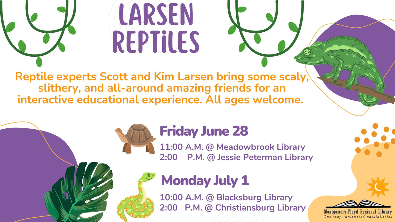 The Jessie Peterman Library presents The Larsens' Amazing World of Reptiles Program on Friday, June 28, 2024.