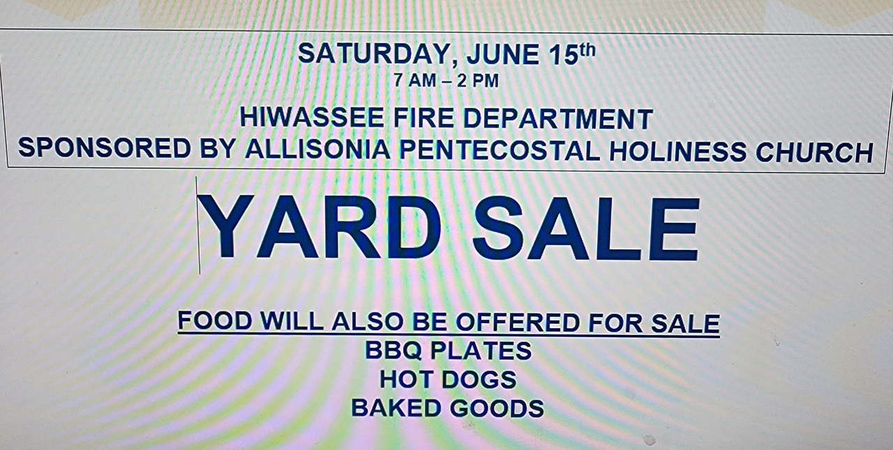 The Hiwassee Volunteer Fire Department presents Yard Sale and Bake Sale Fundraiser on Saturday, June 15, 2024.