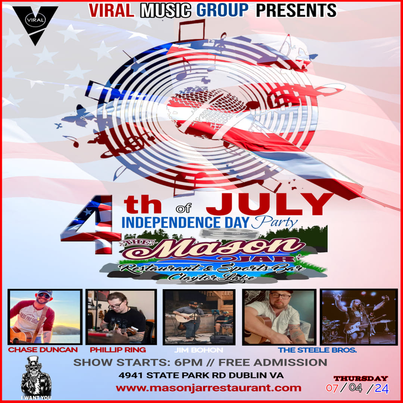 The Mason Jar at Claytor Lake and Viral Music Group presents 4th of July Independence Day Party with Chase Duncan, Phillip Ring, Jim Bohon and The Steele Brothers on Thursday, July 4, 2024.