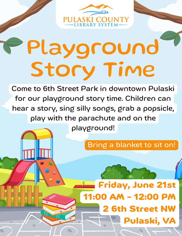 The Pulaski Library presents a Playground Story Time on Friday, June 21, 2024 at Sixth Street Park in Pulaski, VA.