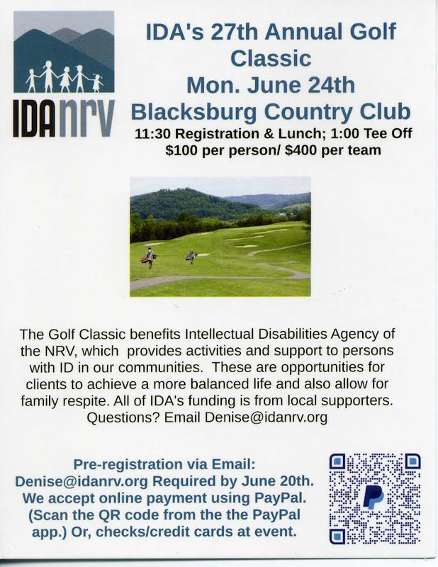 Intellectual Disabilities Agency of the New River Valley (IDA) presents their 27th Annual Golf Classic on Monday, June 24, 2024 at Blacksburg Country Club.