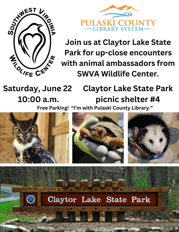 The Pulaski County Library System presents the program "Southwest Virginia Wildlife" at Claytor Lake State Park on Saturday, June 22, 2024 at Claytor Lake State Park Picnic Shelter #4.