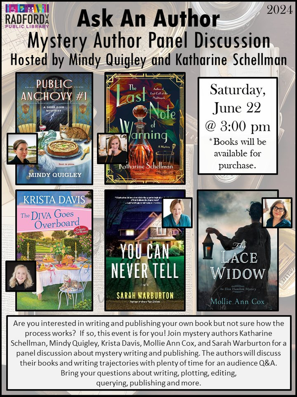 The Radford Public Library presents Ask An Author: Mystery Author Panel Discussion hosted By Mindy Quigley and Katharine Schellman on Saturday, June 22, 2024.