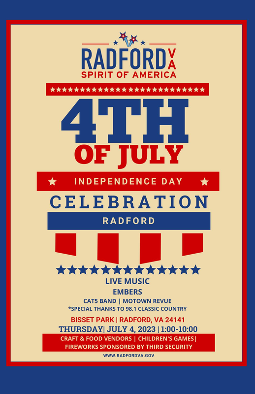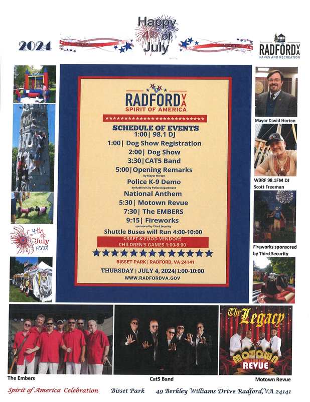 The City of Radford presents their 2024 "Spirit of America" July 4th Celebration on Thursday, July 4, 2024 at Bisset Park.