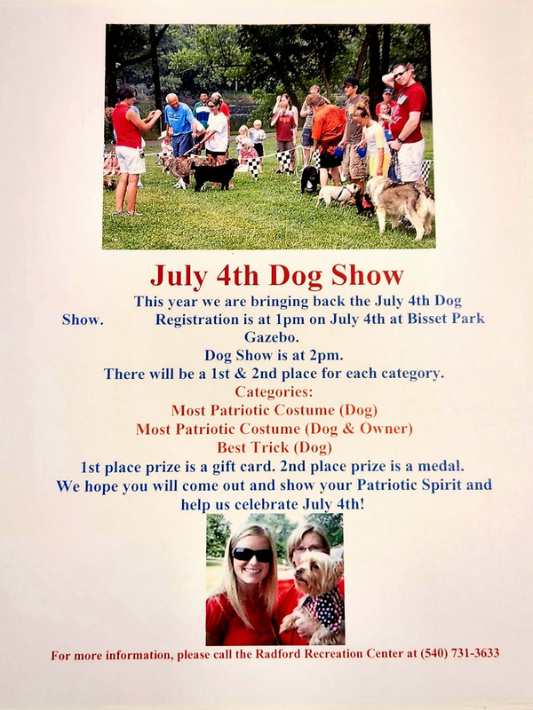 https://www.twitter.com/theembersThis year marks the return of the July 4th Dog Show. Registration is at 1:00 PM across from Shelter #1 parking lot under the trees. Please make sure to register as you arrive. Dog show parking will be located at the first parking lot to the right on New River Drive behind the old clothing bank. It's a short walk to the Dog Show area. There will be 1st and 2nd places for each category including: Most Patriotic Costume, Most Patriotic Costume (Dog & Owner), Best Trick on Command and other categories. The 1st place prize is a gift card and the 2nd place prize is a medal. All dogs must be on a leash. Please provide water and pick up after your dog. To view the dog show flyer, visit: