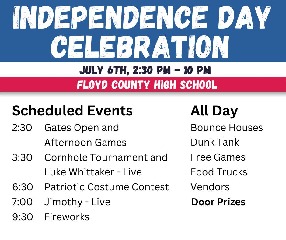 The Floyd County Parks & Recreation present the 2024 Floyd County Independence Day Celebration at Floyd County High School on Saturday, July 6, 2024.