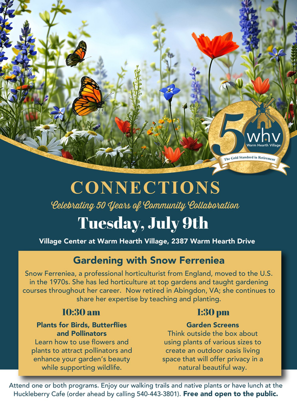 Warm Hearth Village presents the Connections program Gardening with Snow Ferreniea titled "Plants for Birds, Butterflies and Pollinators" on Tuesday, July 9, 2024 at the Warm Hearth Village Center.