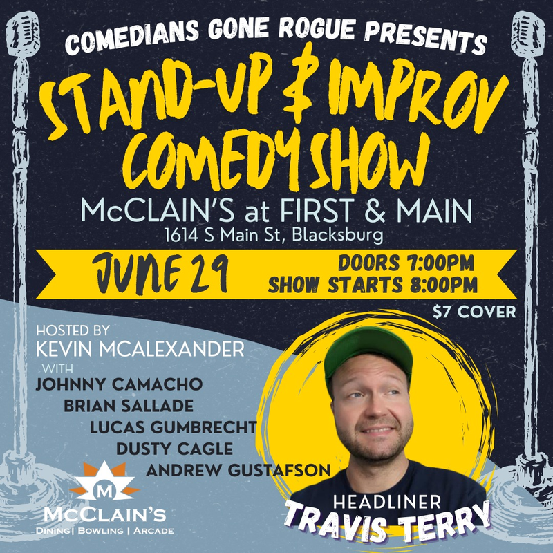 McClain's at First & Main presents Stand-Up & Improv Comedy Show from Comedians Gone Rogue featuring Headliner Travis Terry on Saturday, June 29, 2024.
