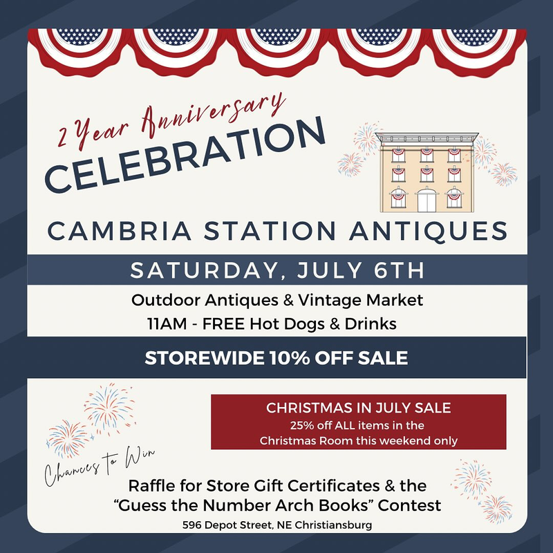 Cambria Station Antiques presents their Two Year Anniversary Celebration with Free Hot Dogs & Drinks on Saturday, July 6, 2024.