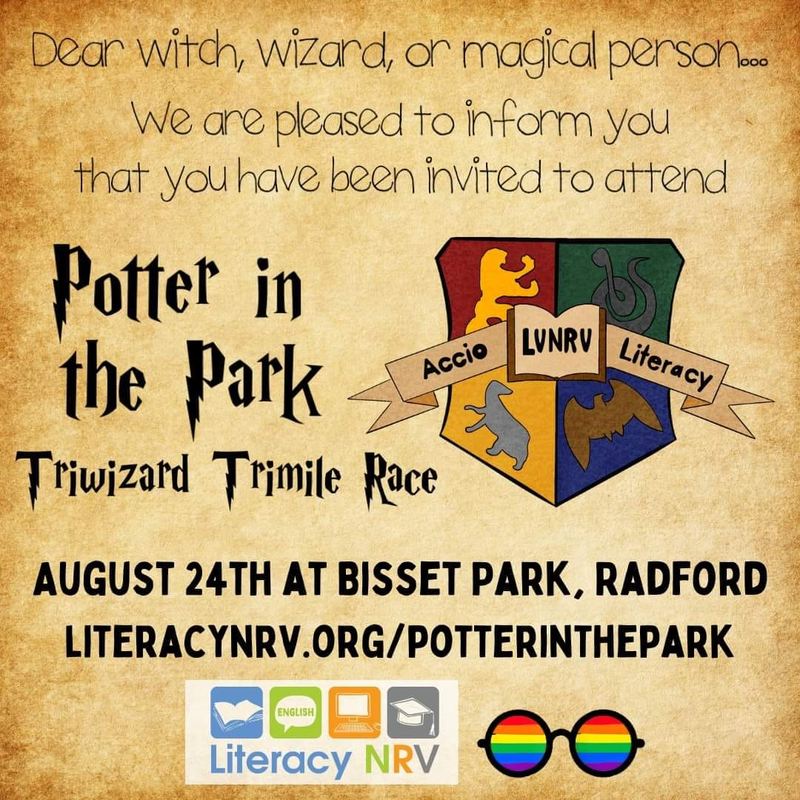 The Literacy Volunteers of the New River Valley presents the 2024 TriWizard TriMile Potter in the Park Race on Saturday, August 24, 2024 at Bisset Park in Radford, VA.