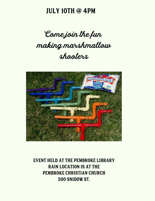 The Pembroke Women's Club and the Pembroke Library presents the art craft program "Make Marshmallow Shooters" on Wednesday, July 10, 2024 at the Pembroke Library.