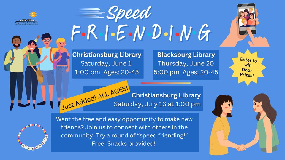 The Christiansburg Library presents Speed Friending for All Ages on Saturday, July 13, 2024.