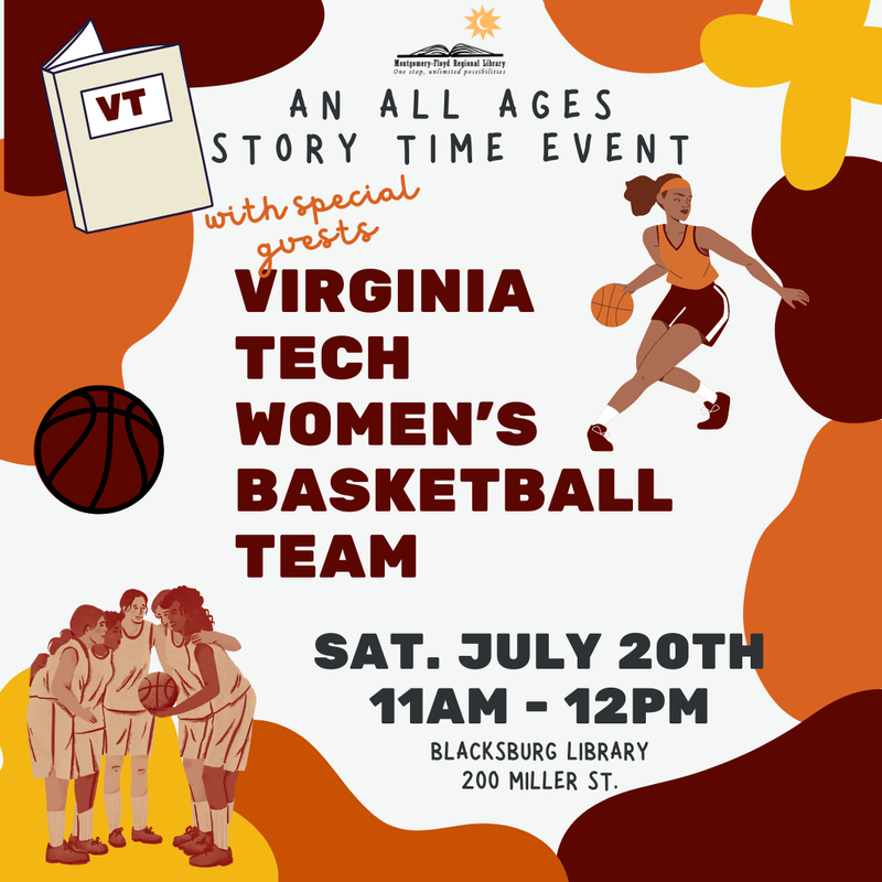 The Blacksburg Library presents An All Ages Story Time Event with the Virginia Tech Women's Basketball Team on Saturday, July 20, 2024.