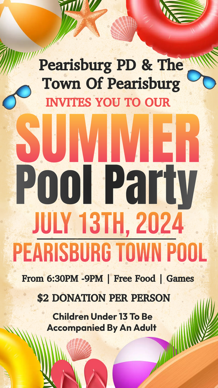 The Pearisburg Police Department and the Town of Pearisburg presents a Summer Pool Party on Saturday, July 13, 2024 at the Pearisburg Town Pool.