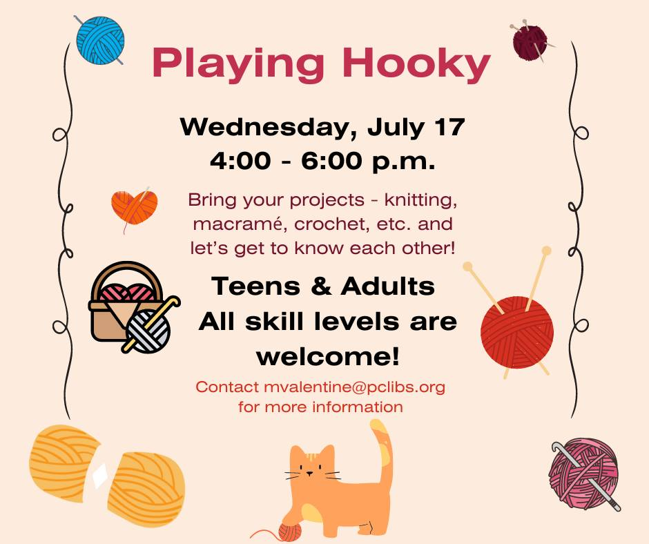 The Pulaski County Library presents the craft group "Playing Hooky" for Teens and Adults on Wednesday, June 26, 2024.