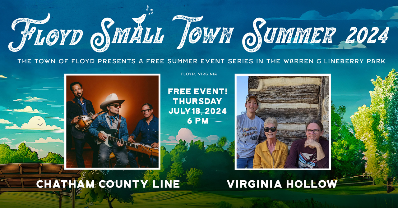 The Town of Floyd continues their 7th Annual Floyd Small Town Summer event series with Chatham County Line and Virginia Hollow in concert on Thursday, July 18, 2024 outside at Warren G. Lineberry Memorial Park.