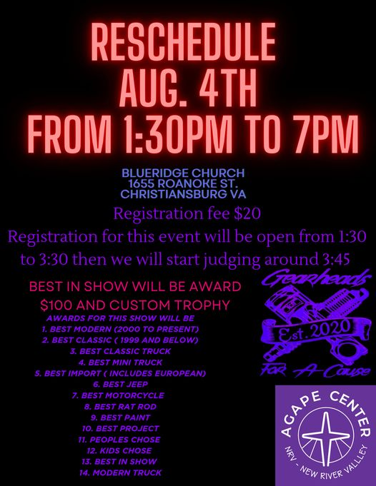 All proceeds from the car show will be going 100% to the Agape Center NRV. Representatives from the Agape will be at Blue Ridge Church to help with any questions and take any donations on site.