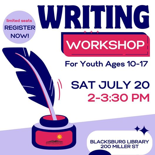 The Blacksburg Library presents a Writer's Workshop for Youth Ages 10-17 on Saturday, July 20, 2024.
