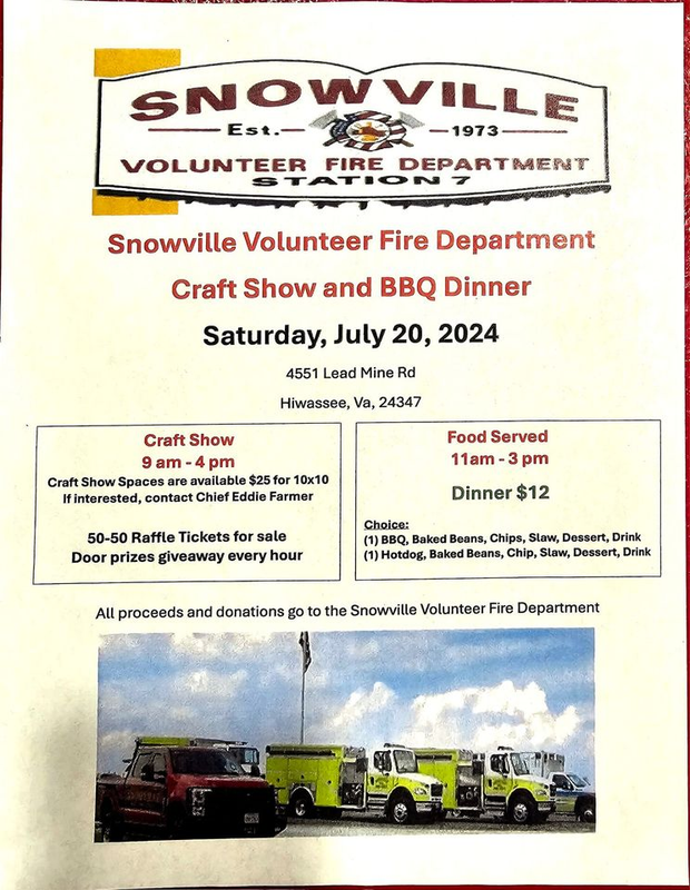 The Snowville Volunteer Fire Department presents a Craft Show and BBQ Dinner on Saturday, July 20, 2024.