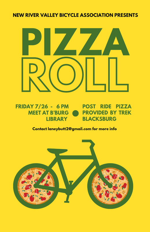 The New River Valley Bicycle Association (NRVBA) presents a Pizza Roll Bike Ride on Friday, July 26, 2024 starting at the Blacksburg Library.