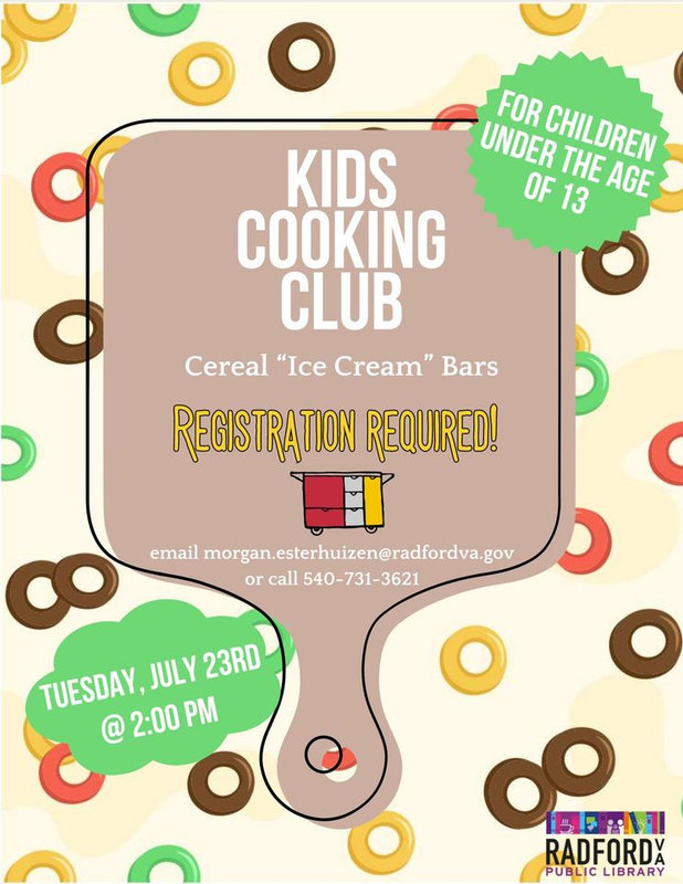 The Radford Public Library continues their Summer Cooking Club for Kids with the event "Make Cereal Ice Cream Bars" on Tuesday, July 23, 2024.