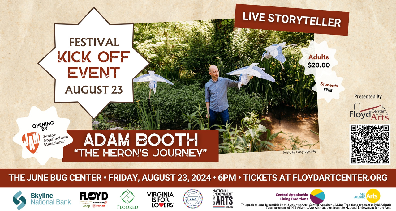 The June Bug Center hosts the Floyd Living Traditions Festival Kick Off Event featuring "The Heron's Journey" by Appalachian storyteller Adam Booth and an opening by Floyd Jams on Friday, August 23, 2024.