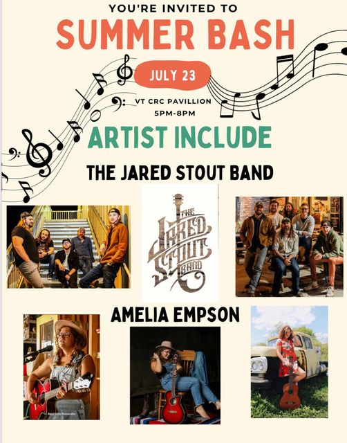 Adjust NRV and the Courtyard By Marriott in Blacksburg, VA presents the Summer Bash with The Jared Stout Band and Amelia Empson on Tuesday, July 23, 2024 at the Virginia Tech Corporate Research Pavilion.