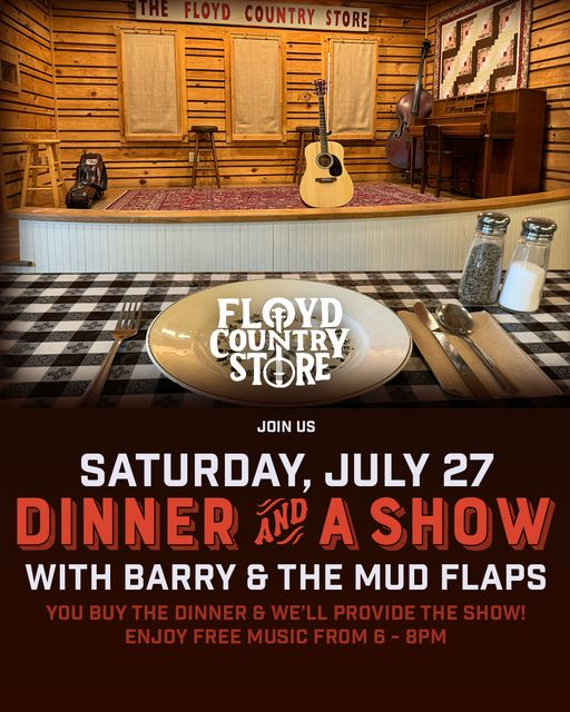 The Floyd Country Store presents Dinner and a Show with Barry & The Mud Flaps on Saturday, July 27, 2024.