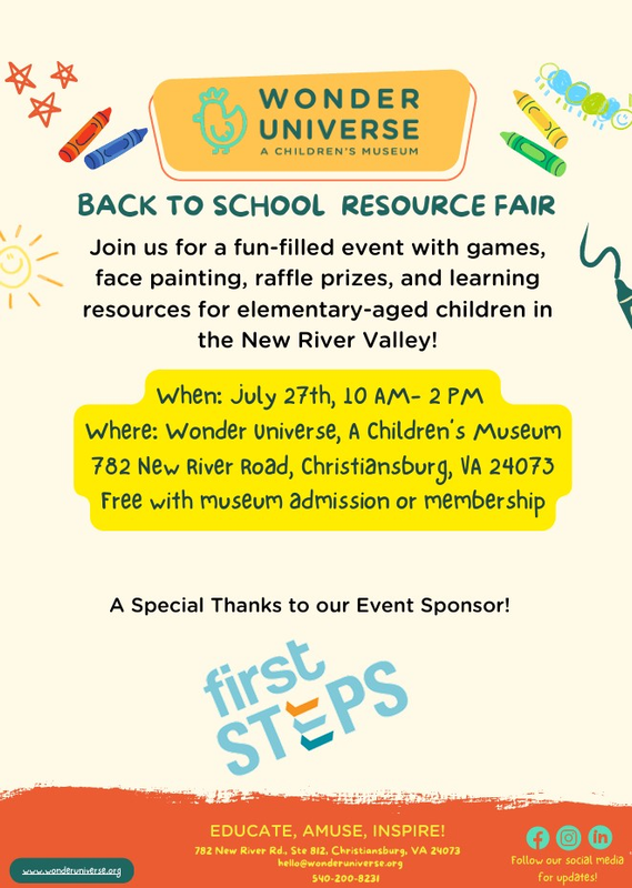 Wonder Universe: A Children's Museum and FirstSteps presents a Back To School Resource Fair on Saturday, July 27, 2024.