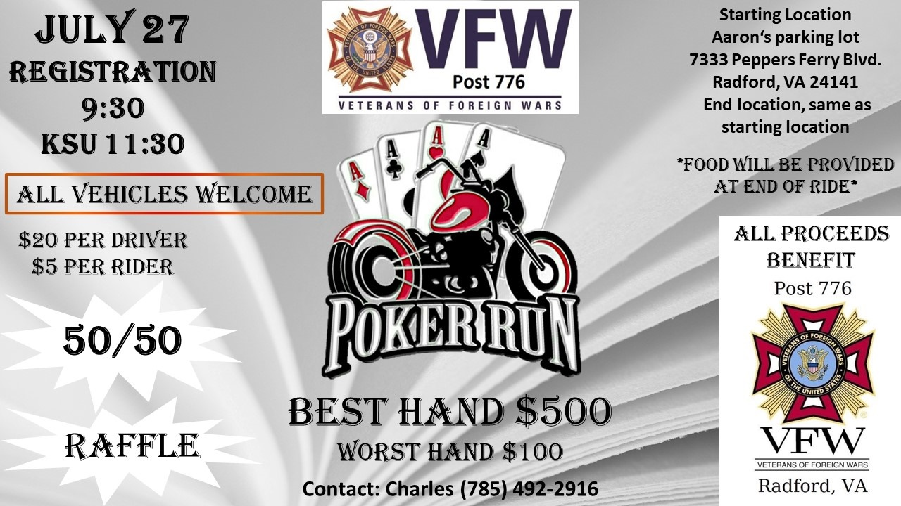 The Veterans of Foreign Wars (VFW) Post 776 hosts a Poker Run on Saturday, July 27, 2024 starting and ending at Aaron's Inc. in Radford, VA.