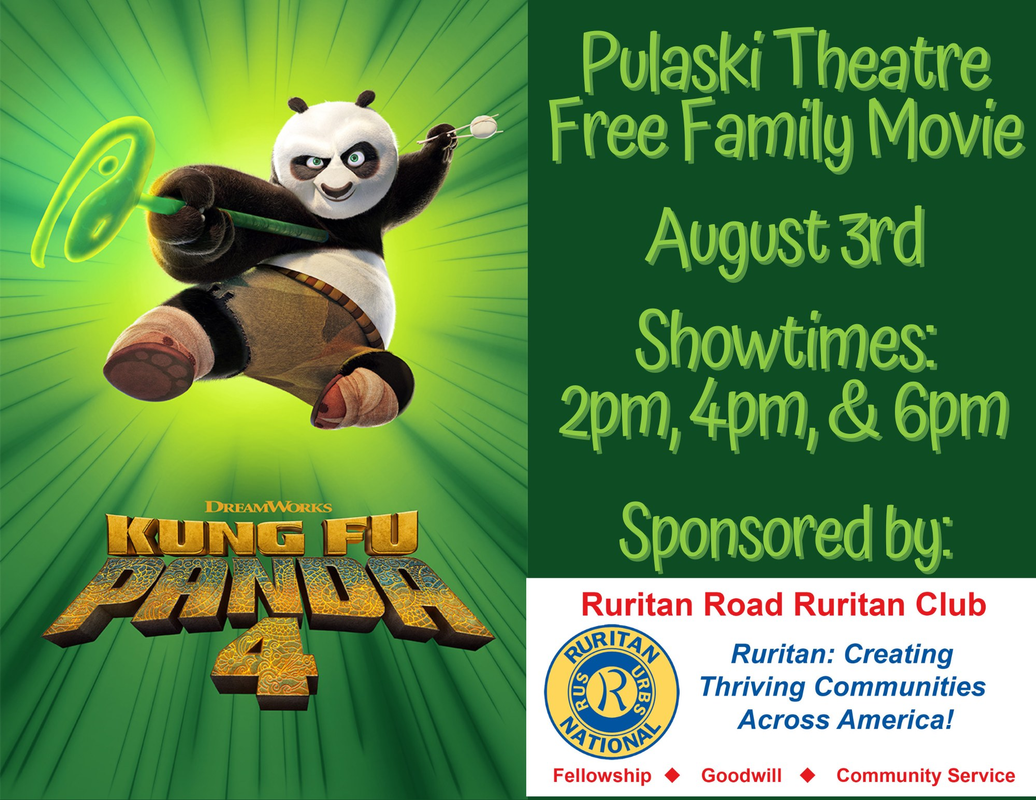 The Ruritan Road Club presents a Free Family Movie: "Kung Fu Panda 4" with three showtimes at 2:00 PM, 4:00 PM and 6:00 PM on Saturday, August 3, 2024 at the Pulaski Theatre.