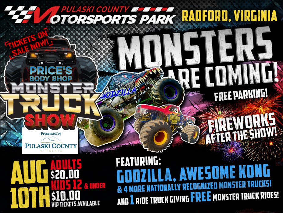 Pulaski County Motorsports Park presents a Monster Truck Show on Saturday, August 10, 2024.