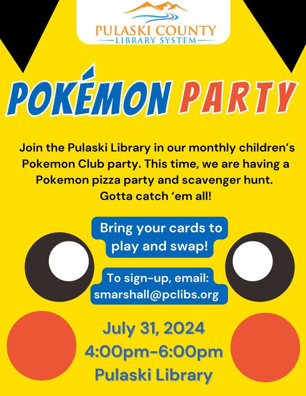 The Pulaski County Library presents a Pokemon Pizza Party on Wednesday, July 31, 2024.