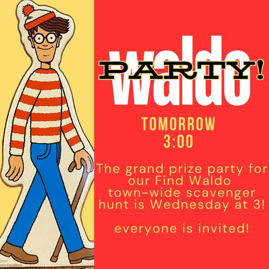 Join us for the culmination of our town-wide Find Waldo scavenger hunt! We'll be celebrating Waldo and all things local, award prizes, enjoy cake and Mayor Leslie Hager-Smith will be on hand to award the Grand Prize.