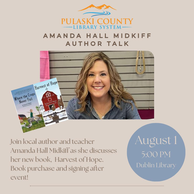 Join local author and teacher Amanda Hall Midkiff at Dublin Library as she discusses her new book, "Harvest of Hope".